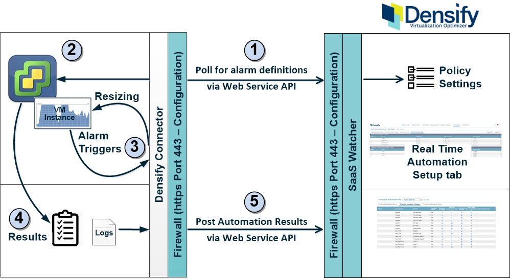 - When CPU or memory utilization exceeds an alarm threshold, an alarm is triggered and the Densify Connector, via a PowerShell script, connects to the vCenter Server and using standard vCenter API calls, applies the recommendations. The required vCenter credentials are encrypted and stored locally by the Densify Connector.